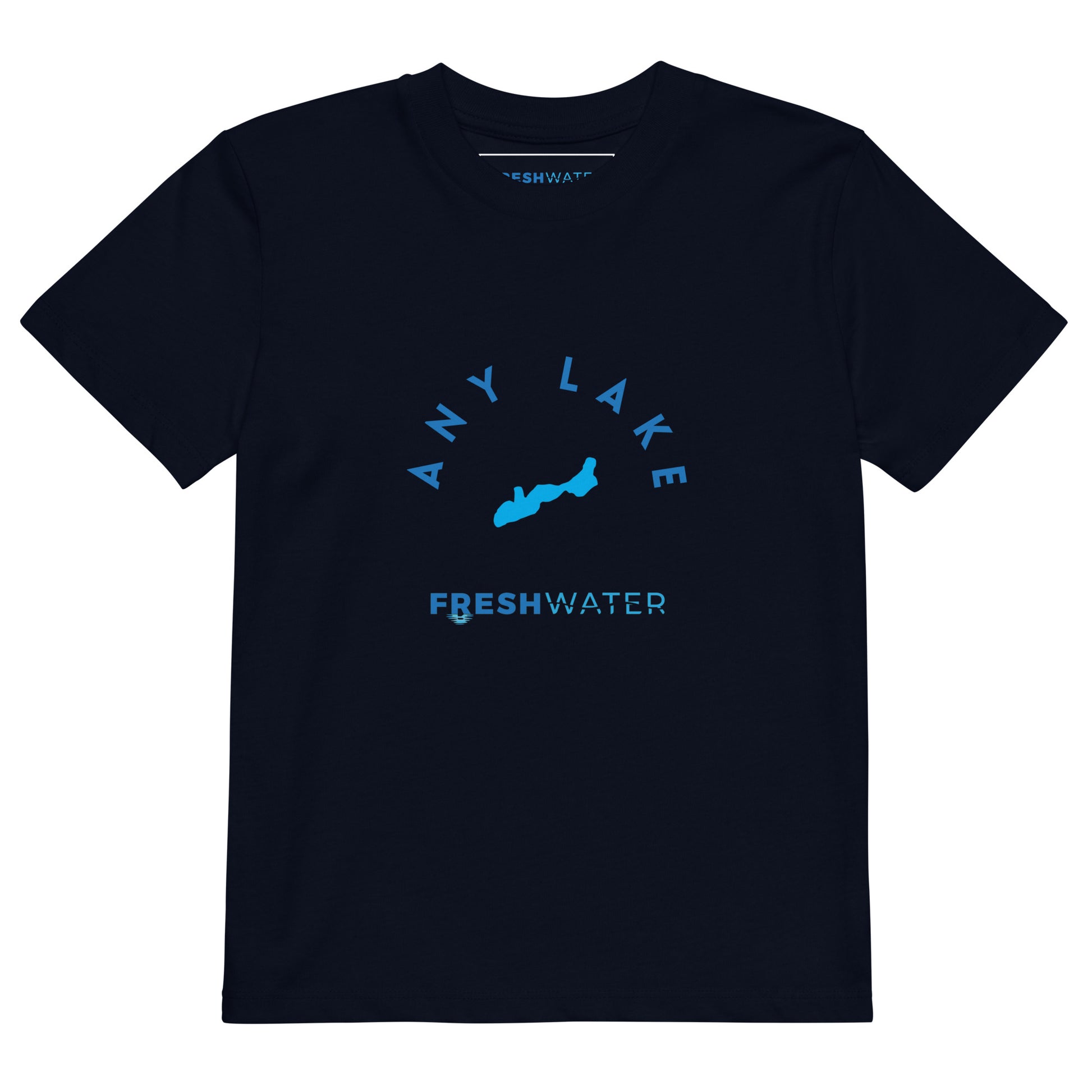 Our Organic FreshKids Tee - custom made with your choice of Freshwater; Pick a size and color. Then, tell us your favorite lake, river, or other Freshwater source The name and outline (if applicable) will be printed on the front of the shirt. A mockup will be sent to your email before final production.